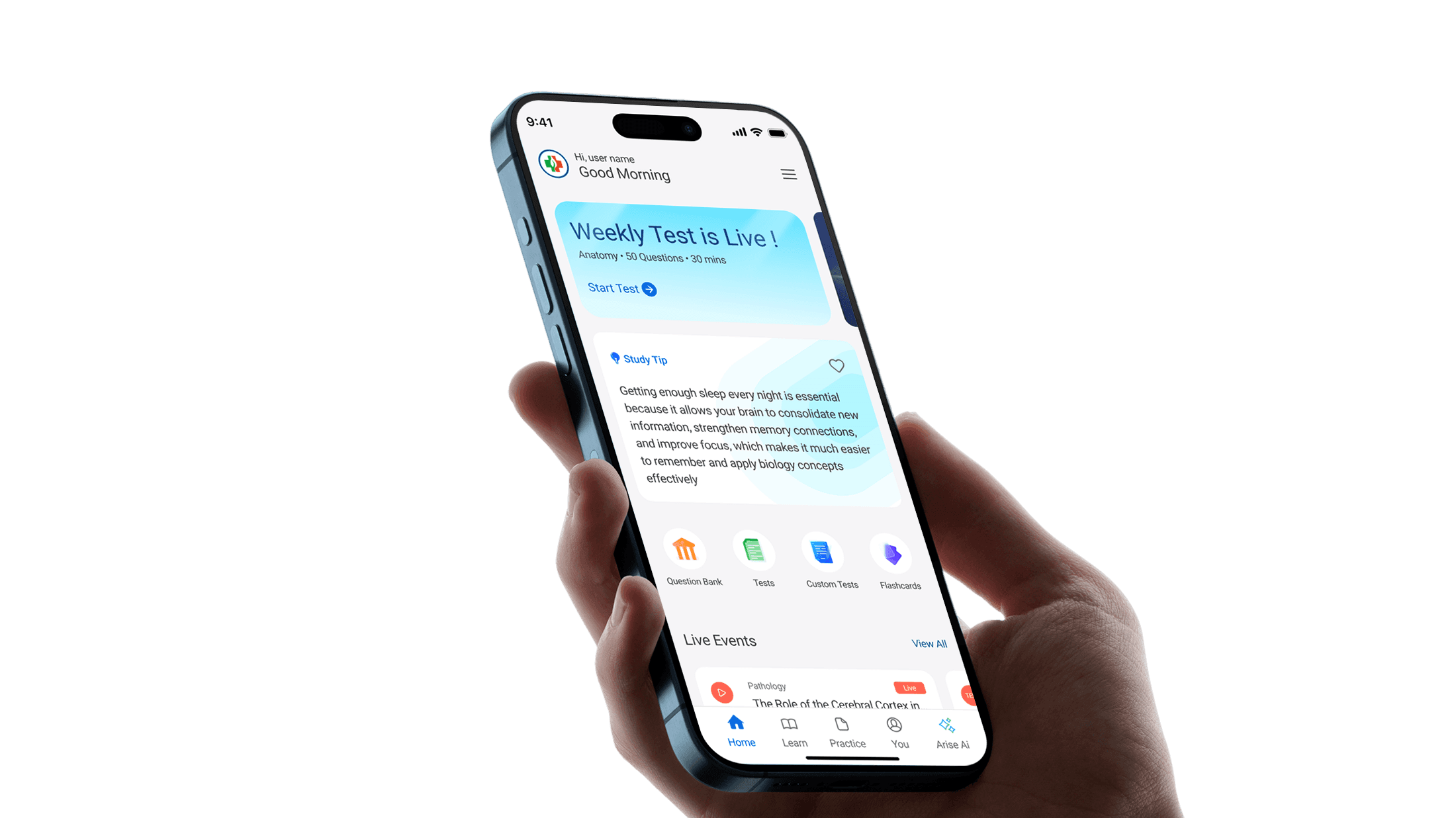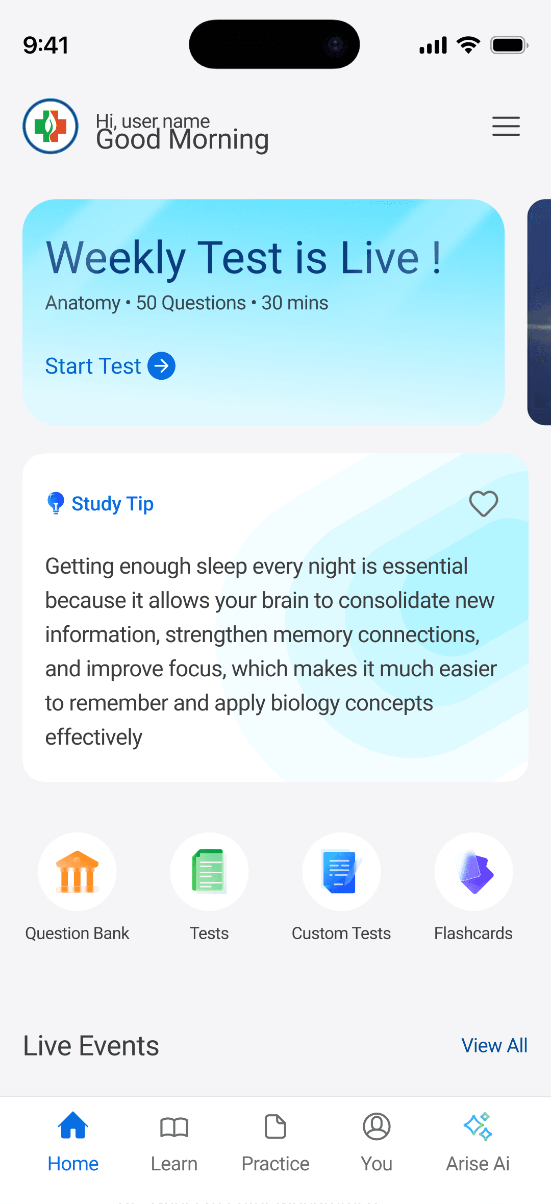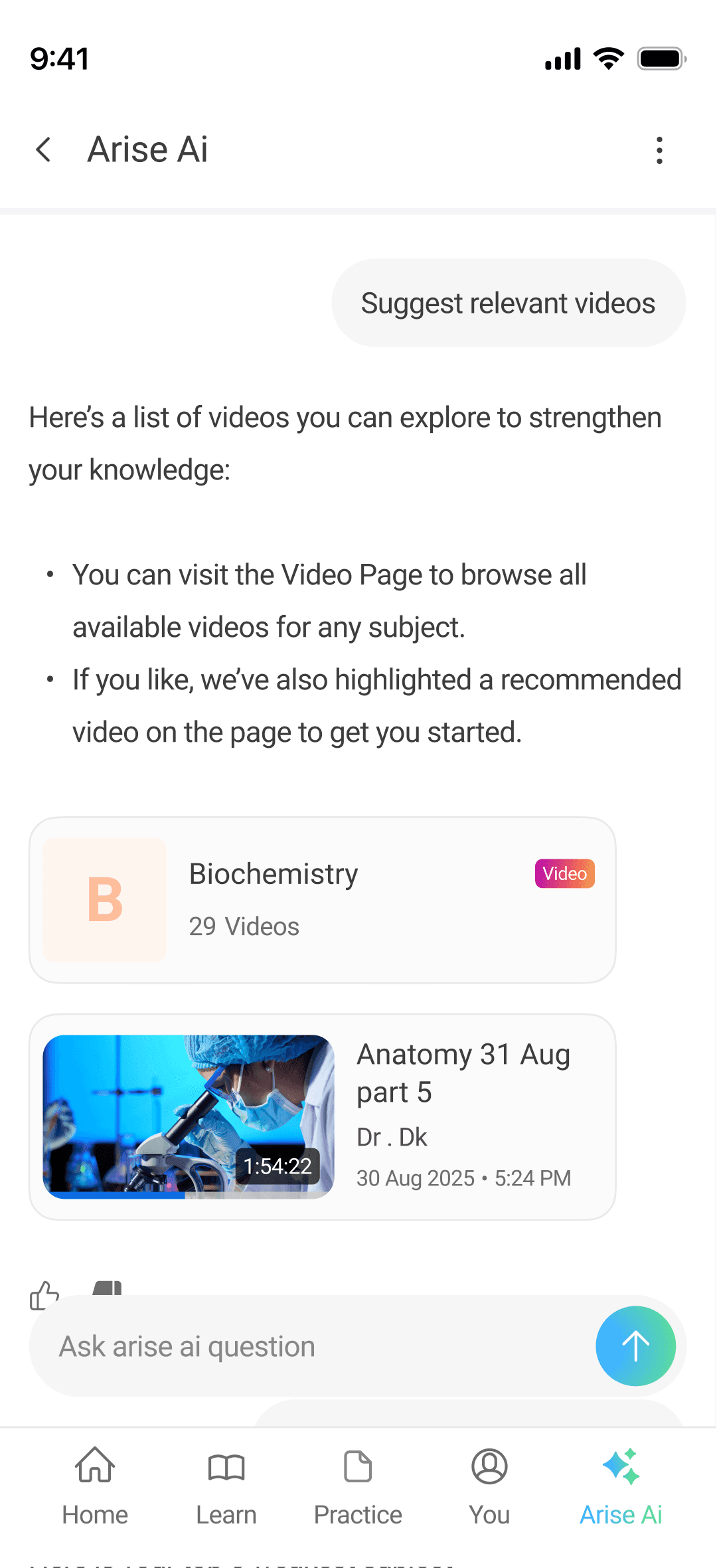 The Arise Medical Academy app was redesigned to introduce AI-assisted learning that helps students study smarter. By integrating AI systems trained on the platform’s existing academic resources—such as notes, PDFs, videos, and question banks—the app can analyze student behavior, track performance across subjects, and provide personalized insights. These intelligent systems review learning patterns, identify strengths and weak areas, and recommend what students should focus on next to improve their results.