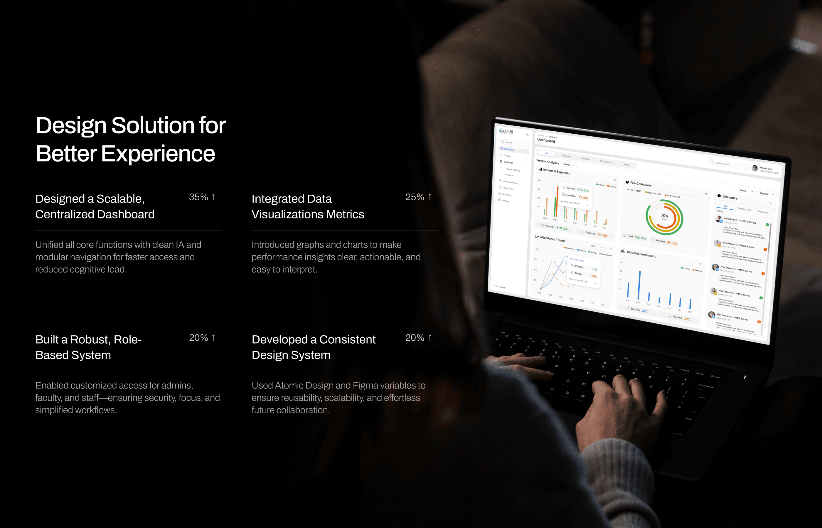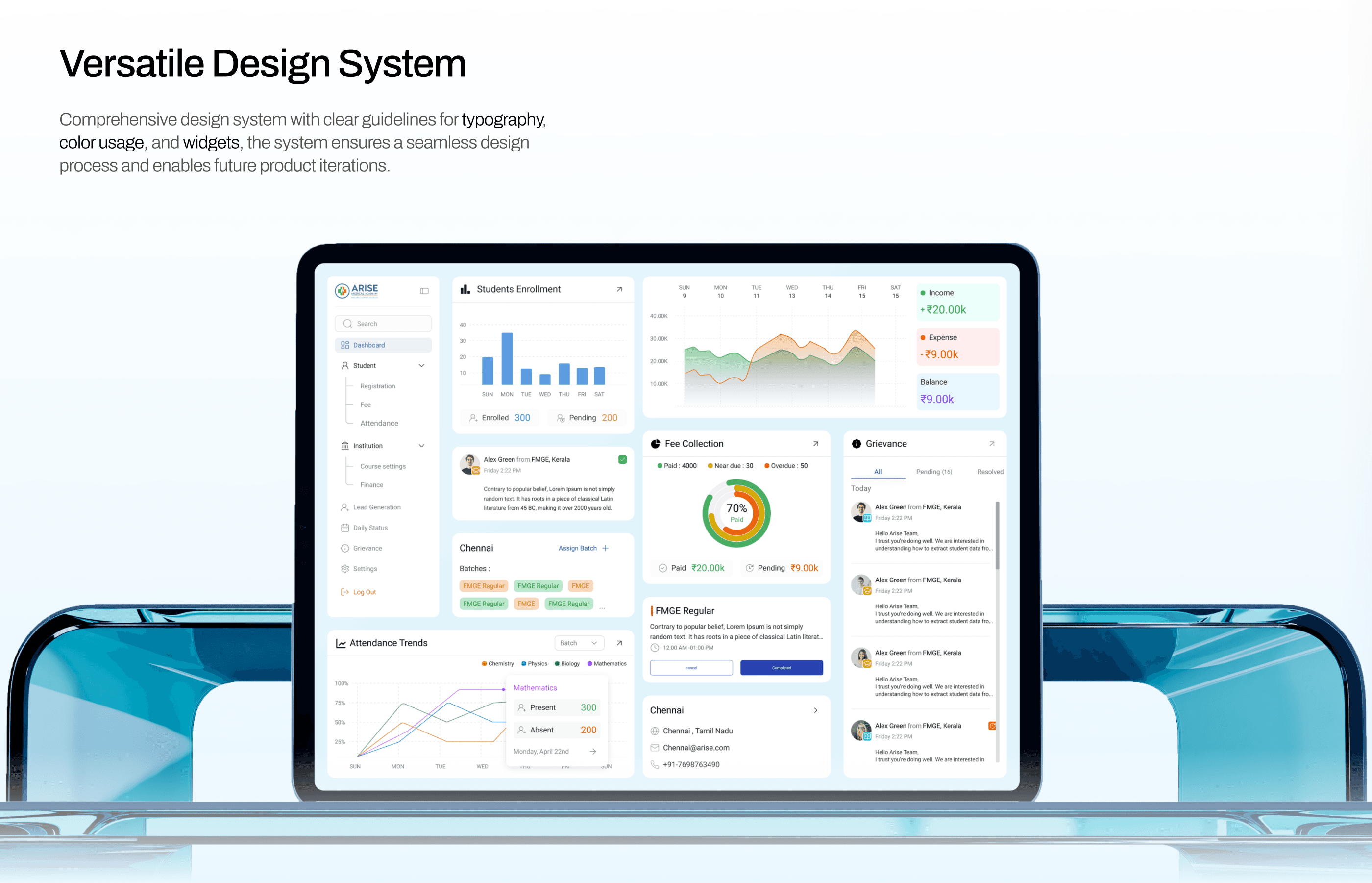 I reworked user flows, improved hierarchy and visuals, and added analytics for students, finance, notifications, feedback, and tickets. I also built a scalable design system using Atomic Design, making the product consistent and easy to expand